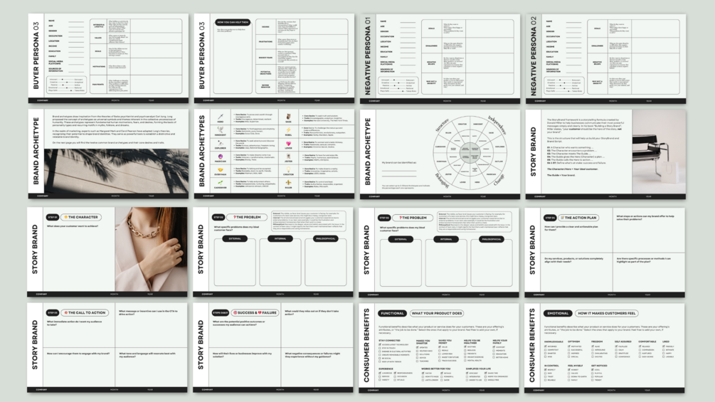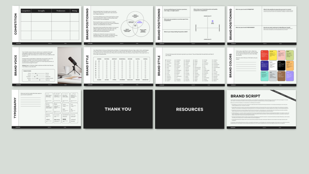 - Impress your clients with a professional-looking, comprehensive brand strategy workbook.