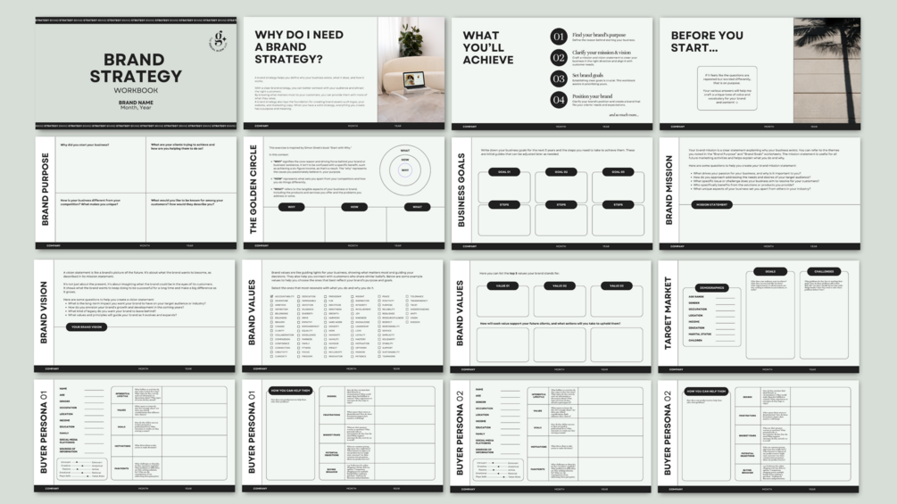 You'll get a 100% fully editable Brand Strategy Workbook Canva Template