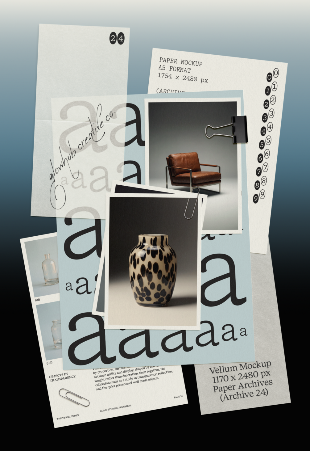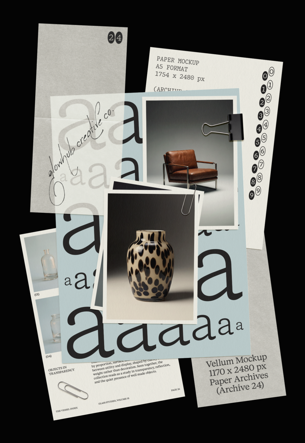 Paper Archives is a mockup collection inspired by the visual language of the late 1990s and early 2000s. Binders, plastic sleeves, vellum sheets, folders, punched paper, paper clips, and everyday office print pieces form the core of the collection. The mockups are designed to showcase print, editorial layouts, branding, and visual work in a tactile, restrained way, without distracting from the content itself.